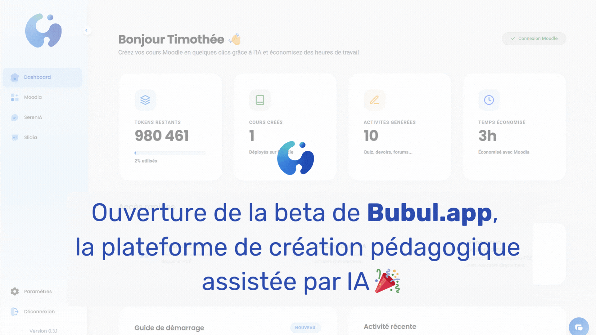 Cette instance sert de démonstration de la création de cours Moodle depuis Bubule. Attention : les cours de cette plateforme seront potentiellement supprimés après la période de BETA. Si vous avez besoin de récupérer ces cours, n'hésitez pas à contacter le support Bubul à l'adresse contact@bubul.app